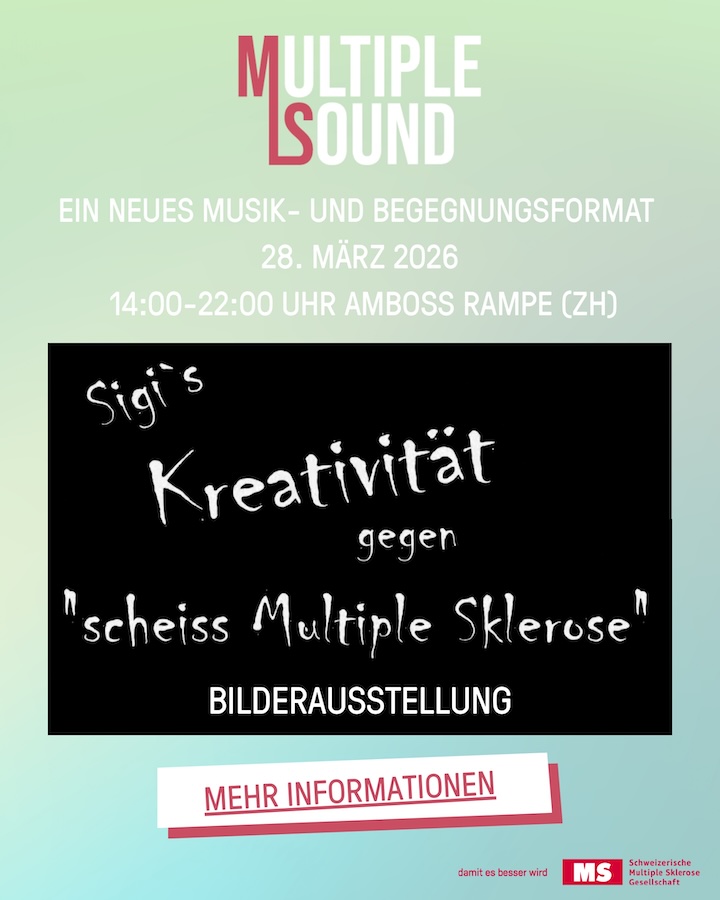 Ich stelle am 28. März beim neuen Event «Multiple Sound» in der Amboss Rampe in Zürich einige meiner Bilder aus. Unter dem Motto «Kreativität gegen scheiss Multiple Sklerose» zeige ich meine Werke – und wer mag, kann sie auch direkt vor Ort kaufen.